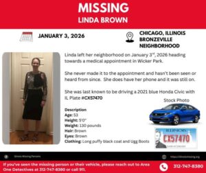 Authorities and family members are asking for the public’s help in locating **Linda Brown**, a **53-year-old woman** who has been missing since **January 3, 2026**, after leaving her neighborhood to attend a **medical appointment in Chicago’s Wicker Park area**.